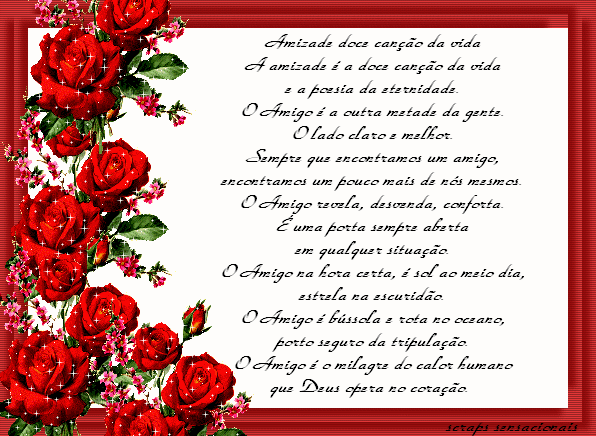 As páginas da vida são cheias de surpresa. Há capítulos de alegria mas também de tristeza, há mistérios e fantasias, sofrimentos e decepções. Por isso não rasgue páginas nem salte capítulos, não se apresse em descobrir os mistérios, não perca as esperanças, pois muitos são os finais felizes. E nunca se esqueça do principal: No livro da vida, o autor é você!!"A AMIZADE"